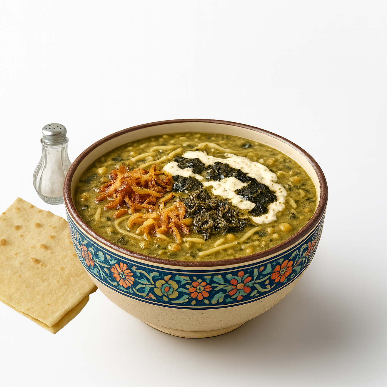 Slow-cooked Persian ash, prepared with fresh herbs, beans, and noodles, and topped with three traditional garnishes: kashk, crispy fried onions, and aromatic mint oil.